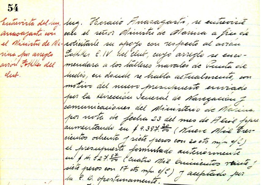 Voor dit doel, en met medewerking van het Directoraat Marine Luchtvaart, werd de motor overgebracht van de marinebasis Punta Indio naar Casa Amarilla; en de betaling van 48 dollar werd bevolen aan Despachante Antonio Blanco om de verzending van de motor te regelen.