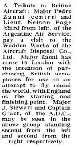 Met de uitdrukkelijke toestemming van de ministeries van Oorlog en van Marine bestond de bemanning uit Zanni, vaandrig Nelson Tomás Page en 1e luchtvaartmonteur Felipe Carlos Antonio Beltrame (chef monteurs van het militaire vliegveld El Palomar) die op 31 januari 1923 naar Europa vertrokken en eind februari in Londen aankwamen.