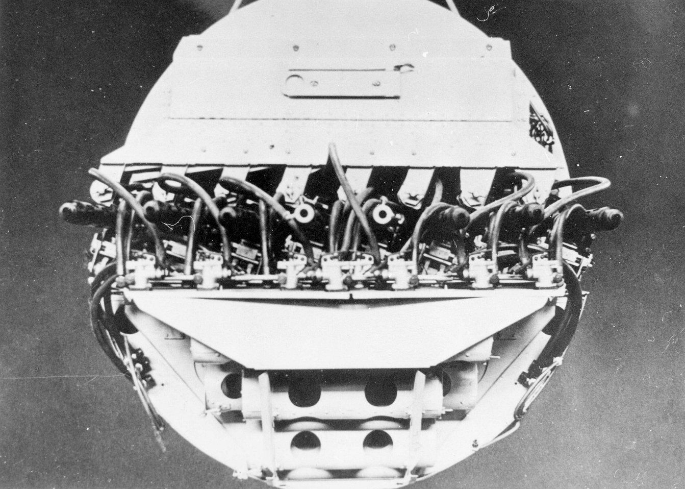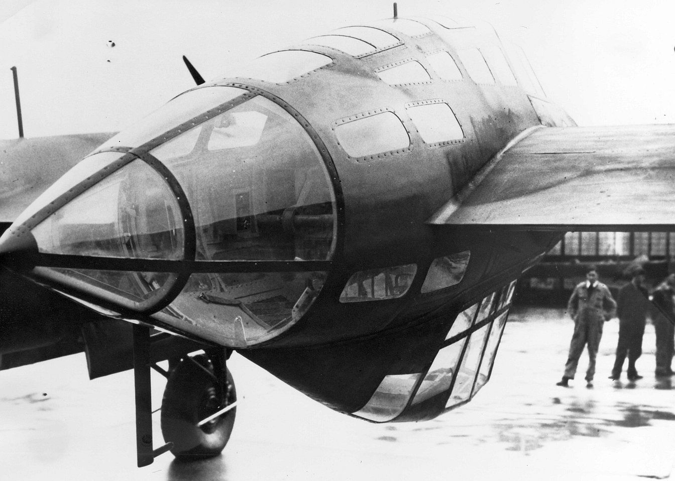 Het voorstuk van de cockpit en de neus met de plek voor de mitrailleurs of kanonnen.
